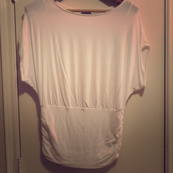 Cream colored flowy top with fitted waist and ruching details on the bottom sides. Light weight and great for spring and summer. Some wear.