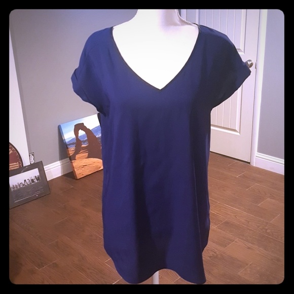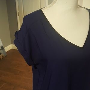 Cuffed short sleeved top dark blue with black trim around v neck collar