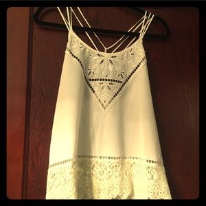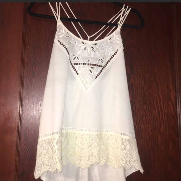 Absolute gorgeous off white colored tank with awesome 3 strap detailing. Lace with iridescent shimmer at top & bottom. Flowy style tank, very flattering!!! Dressy but yet comfy! Back is a silky cotton material!