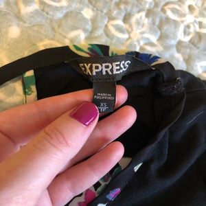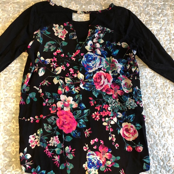 Express top with flowers and keyhole cutout. Price reflects small bleach splatter on one sleeve.