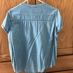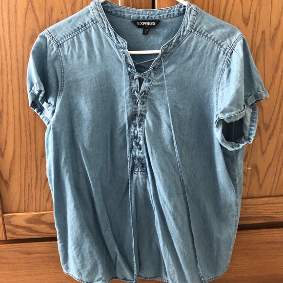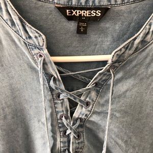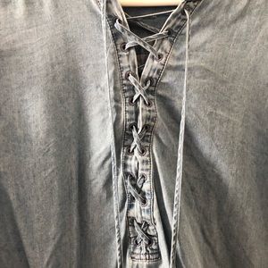 Faded blue jean type texture and color. Only worn once! It has a tie at the front where you can make it tighter or looser. Depending on how much skin you’re wanting to show!
