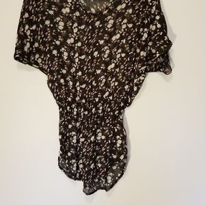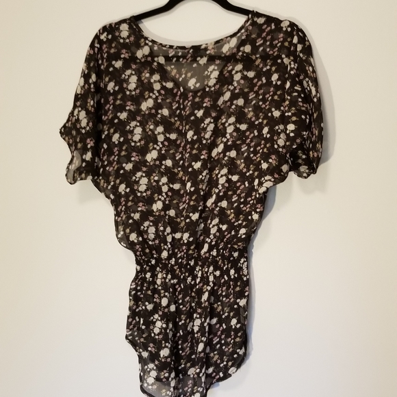 Black top with flowers. See through material, some sparkle. Some signs of wear