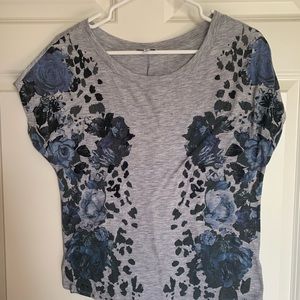 Grey shirt with blue and black flowers. Great condition. Nothing wrong with it, just trying to size down my closet. Runs big. I normally wear a medium in tops.