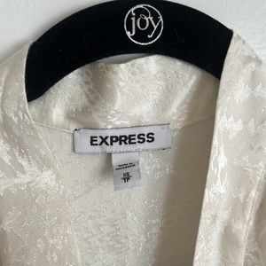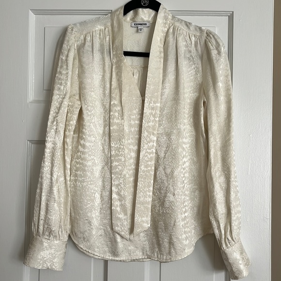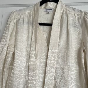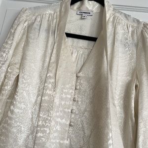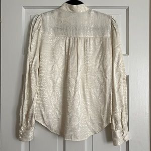 Beautiful blouse! There is a shimmery detail throughout the shirt. The ties can be down several different ways and there are beautiful button detailing on the neck line and sleeves