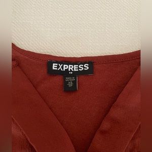 Express blouse in rust orange color, the front part is 100% polyester the back part is 60%cotton 40% modal. Size XS fits a S/small as well, I’m now a medium 🧡