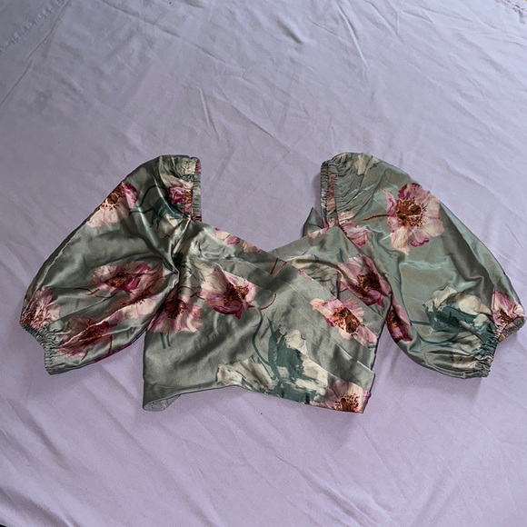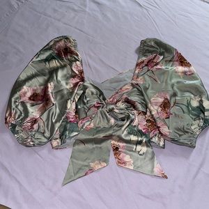 Silky sage green top with pink floral prints, tie at back attached, zip on side