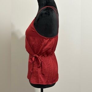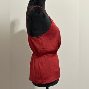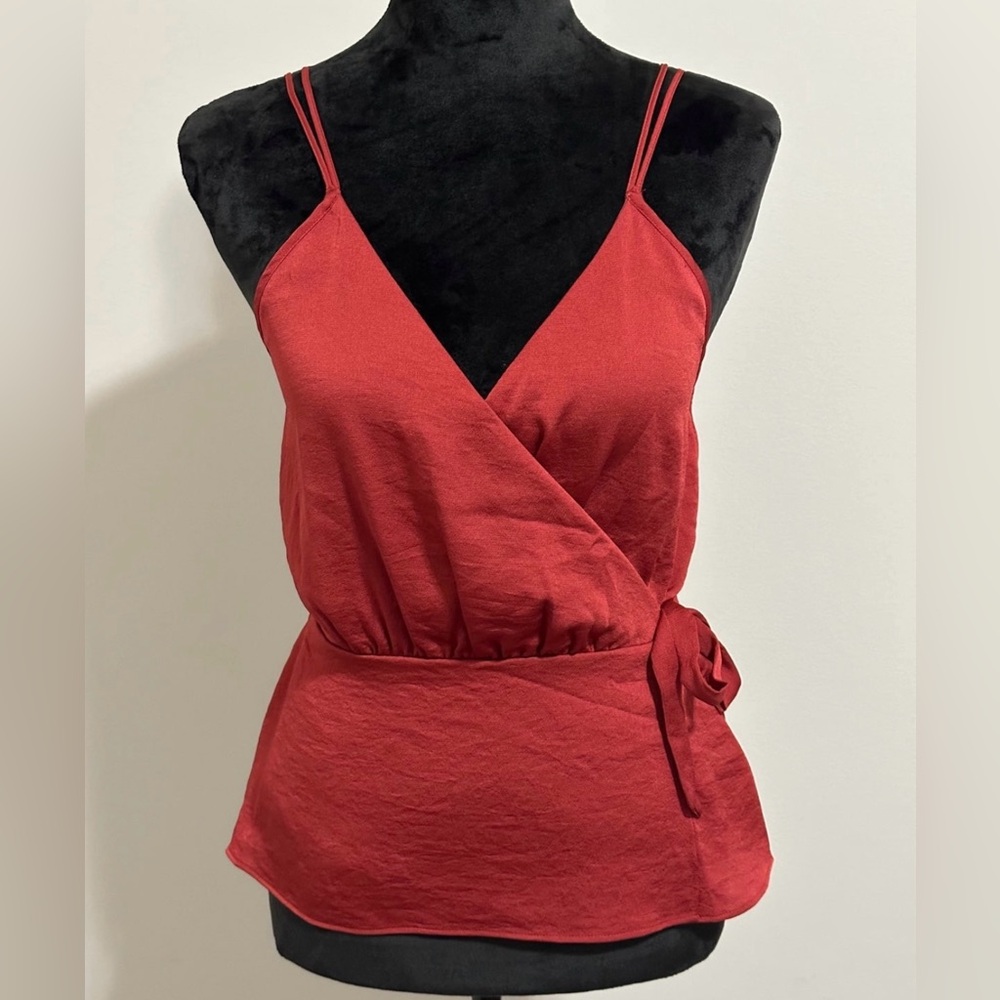 Red wrap style top with spaghetti straps that crisscross in the back. Size small. 100% polyester NWT