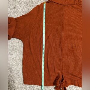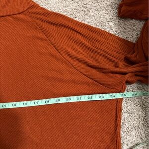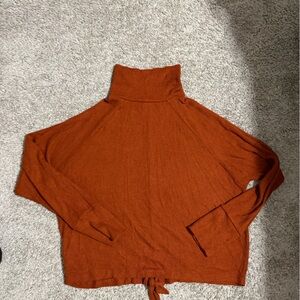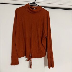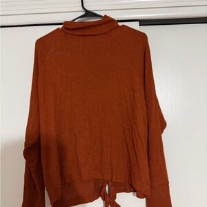 Express top size large. Has a tie in the front, mock neck. Comes to about your waist, not a crop top. See all measurements. Burnt orange color. In good used condition with no stains or holes.
