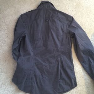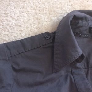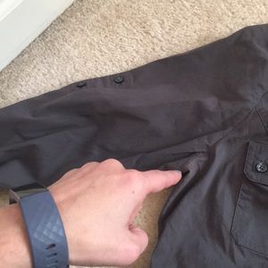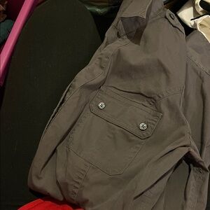 Express size medium stretch button up top roll up sleeves slight discoloration in armpit but you really can’t tell. Color shown against my black pants in last pic for true color.