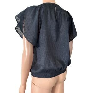 Express top blouse black/gold ruffle sleeve ruched bottom keyhole back SZ SM