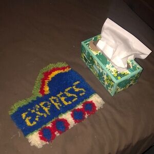 Vibrant Express mini rug with blue, yellow, red, green, and white colors. Perfect for adding a pop of color to any space.
