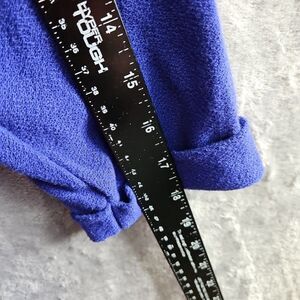 The Express tricot blouse for women in size Large features a vintage style with a round neckline and 3/4 sleeves, making it a versatile and classic piece for any wardrobe. The rich purple color adds a pop of color, while the casual sleeve design adds a relaxed touch to the overall look. Made from a blend of polyester and cotton, this blouse offers comfort and style perfect for everyday wear. Pullover top