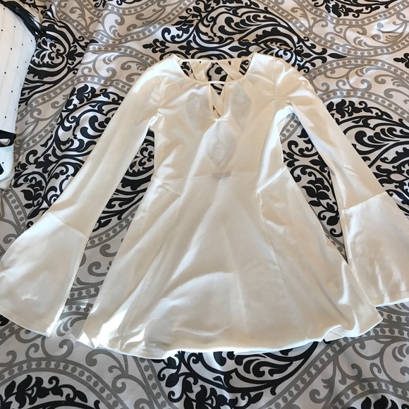Off-white flare tunic. With flared sleeves, keyhole and criss-cross details. Perfect length to wear with leggings.