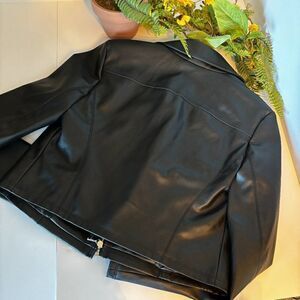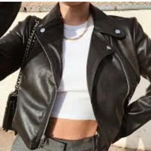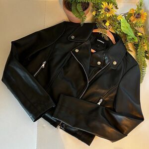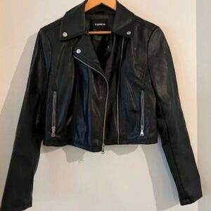 Express vegan leather cropped Moto jacket, black with silver accents, US S. Slightly cropped, hits around the waist. Arms are flexible and loose. Inside fabric is soft and satin-y. Outside fabric is smooth with just a bit of shine; it doesn’t crease or crack like I’ve seen some similar styles do after several wears. It’s a great flexible jacket that’s kept me warm on many nights out!