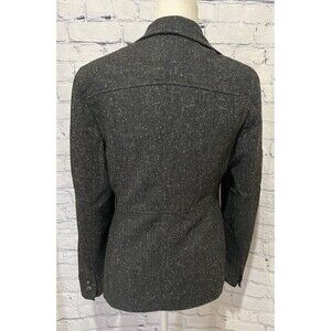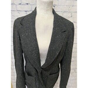 The product is a vintage grey blazer from Express, featuring a one-button front closure and a classic style suitable for workwear or business occasions. Made of a polyester blend, this junior size 7/8 blazer has long sleeves and a lined interior for added comfort. The subtle speck design adds a unique touch to the overall look, making it a versatile and stylish addition to any wardrobe. 16 inch shoulders, 24 inch sleeves and 25 inches long. Smoke free home.