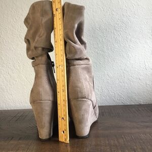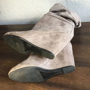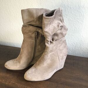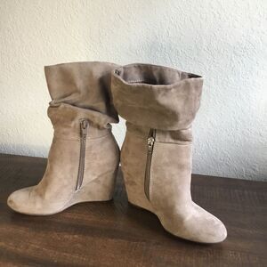 Great condition, minimal wear to sole wedge boots. Man made suede look. 3 1/4” wedge heel. Zipper on inner ankle. Calf length. Express printed tag size 6. A beige tan greige color.