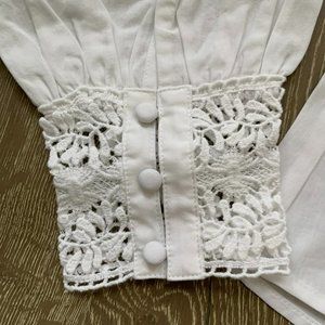 This pretty top from Express features a button-down front with collar and long sleeves with lace detailing at the end. Subtle pleating and slightly cropped length complete the look.