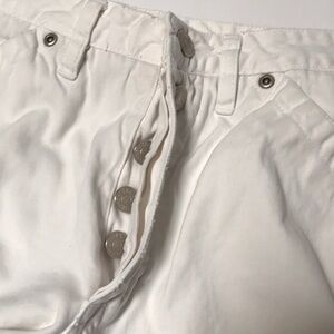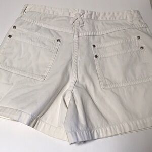 White shorts in pretty good condition. A few spots/minor discoloration as shown in photos that could benefit from a bleach wash. Waist: 30.5 inches. Rise: 10.5 inches. Inseam: 4 inches. Leg opening: 26 inches.