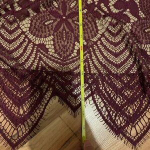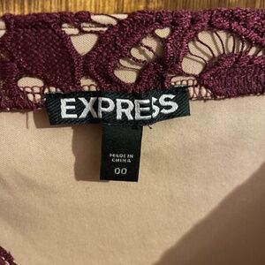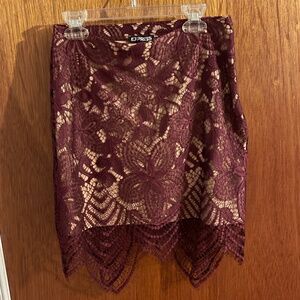 Express form-fitting skirt with wine floral lace and beige underskirt. Zipper is on the side