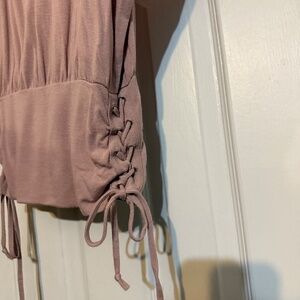 A women's pink Express blouse in size small. It features adorable ties down either side of the shirt, a scoop neck neckline, and is made of modal fabric. This vintage-inspired top is perfect for adding a feminine touch to any outfit, with its pink color and basic style making it versatile for various occasions.