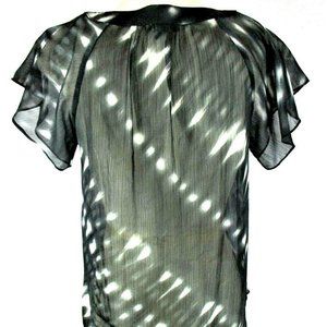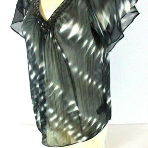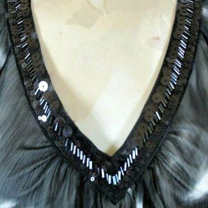 Express women's Small short sleeve black white SEQUINED & BEADED neckline sheer top. (N)