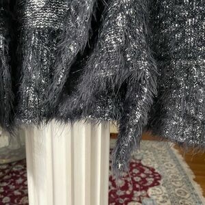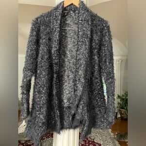 Express women’s Fuzzy Bohemian style Cardigan/ sweater. The material is soft and fuzzy look like Mohair. The size tag is X small- Small. I am medium it fit me perfectly. Look at the measurements it can be medium size open front with shawl caller pit to pit 22” length 25” made of 57% cotton 43% Nylon. It is black fuzzy on white background It has uneven hem line at the front new not used