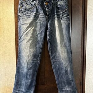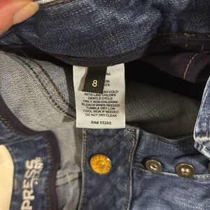Sleek dark wash cropped jeans from Express. Features button fly and classic design.