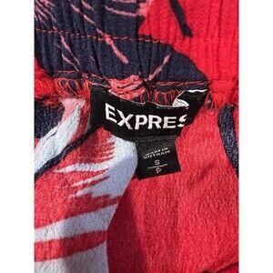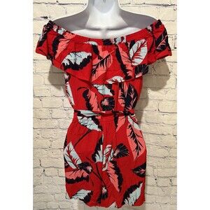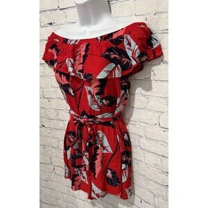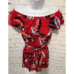 This Express women's red tropical print off-the-shoulder belted shorts romper in size small is a stylish and trendy one-piece outfit perfect for summer and spring seasons. Made of comfortable rayon material, this romper features a floral pattern in a vibrant red color, off-the-shoulder neckline, and pullover closure for easy wear. The belted feature adds a flattering touch to the romper, making it a versatile and fashionable choice for women looking for a chic and effortless outfit. 17 inches pit to pit, 26 inch elastic waist and 27 inches long. Smoke free home.