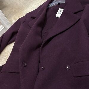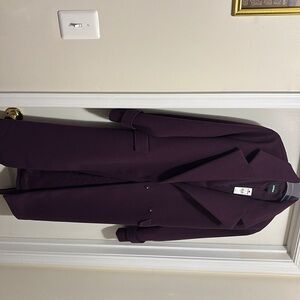 Long purple coat, thin wool, belt, snap buttons, and collar.