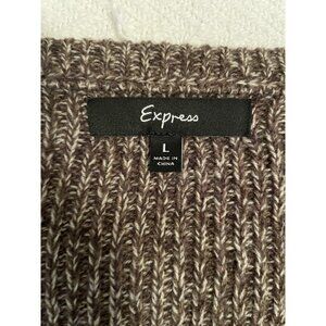 The Express sweater is a women's large brown cable-knit sweater with ruffle accents on the sleeves and hem. It features a round neckline and long sleeves, making it suitable for casual occasions during the winter, fall, and spring seasons. Made from a blend of wool and acrylic, the sweater is machine washable and has a regular fit. The minimalist design and pullover style of the sweater make it a versatile and stylish addition to any woman's wardrobe.