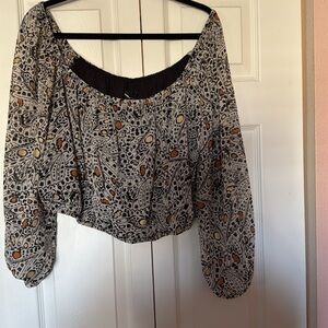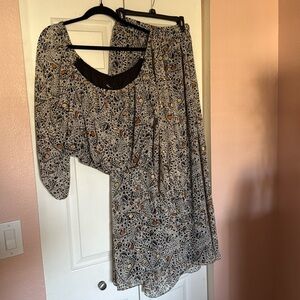 Collab with Expres and Rachel Zoe 2 pc outfit NWT. Shirt is XL and skirt is L. I wear and XL and this skirt fit me perfectly. 100% polyester chiffon like material. Skirt is fully lined and maxi length. I am 5’4” and it hits right at the ground. Shirt is cropped with an elastic band.