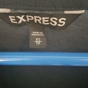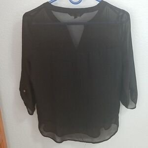 Sleeves, bottom and back are sheer black. Front has an extra lining that starts above the pockets. Smoke free home.