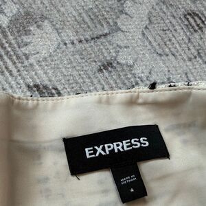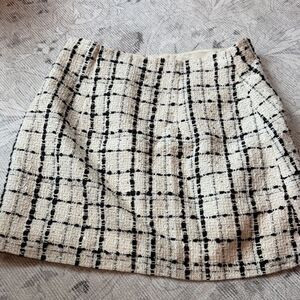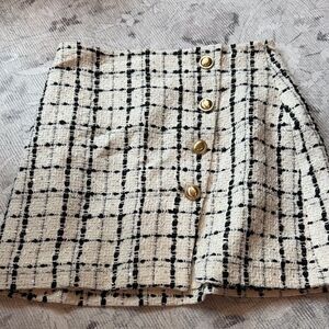 Stylish asymmetrical skirt by Express. Features a black and white plaid pattern. Accented with gold buttons for a modern touch.