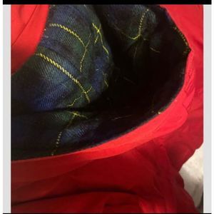 red. Down filled. Detachable plaid-lined hood. High collar.