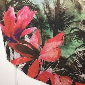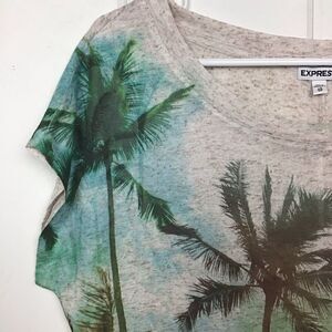 Express short sleeve tee in heathered beige with red flowers in green palm trees. Size XS. 85% polyester, 15% linen. This tee has a tropical feel & is in excellent shape. Would be great for spring break or your next vacation! #bateau neckline