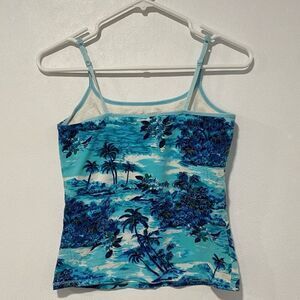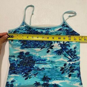 Give off Y2K island girl vibes with this Express tropical tank! Size M. Soft cotton with spandex stretch, featuring palm trees and ocean graphics in dreamy blues.