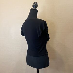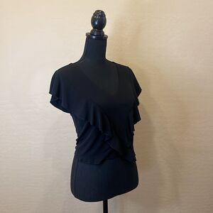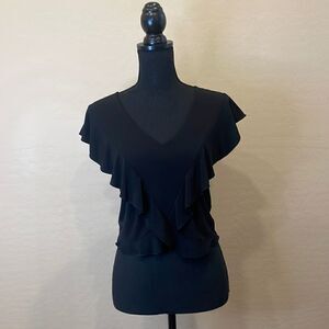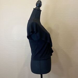 This is an Express brand ruffle detail black crop top. It is in excellent condition. Please see photos for measurements and fabric composition.