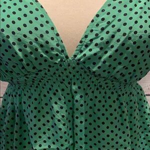Express Design Studio tank size XS. Color is green with small black polka dots. Adjustable straps with stretch material under breast. 100% silk. Preloved in great condition. From smoke free home.