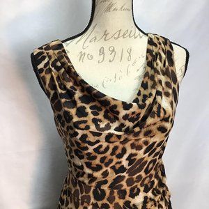 Sleeveless tank dress with ruched skirt, draped neck, crisscrossed back, side zip closure, hits above the knee, fully lined