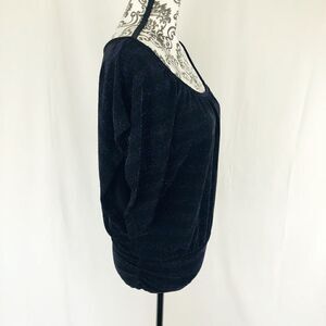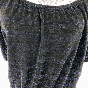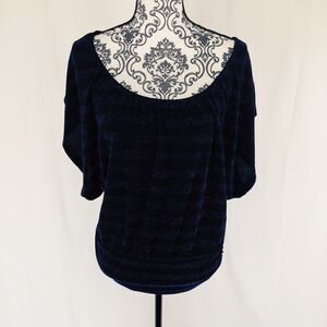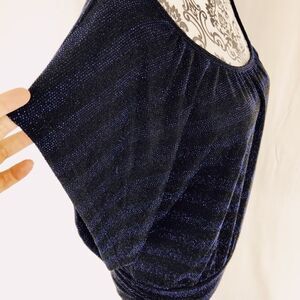New with tags Express blue and black striped top with glitter accent size small. Dolman sleeve design with open back. Tie back closure and crewneck collar. Super chic and classy!