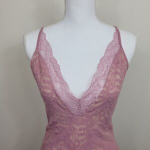 Add a touch of elegance to your wardrobe with this Express Lace Bodysuit in a lovely pink hue. Featuring intricate lace detailing, this bodysuit combines sophistication with a flattering fit. The sheer lace design and adjustable snap closure offer both style and comfort, making it perfect for layering under jackets or pairing with your favorite skirts or jeans. Ideal for a night out or a special occasion, this bodysuit is a versatile and chic addition to any collection.