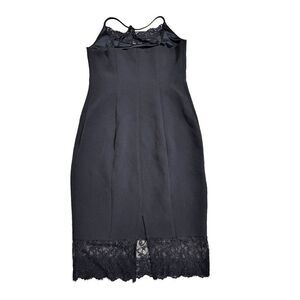Little black dress from Express has lace trim at neckline and hem. Criss Cross adjustable straps. Hidden side zipper closure. Back slit. Fully lined.