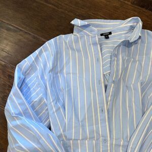 Stylish light blue dress with white stripes. Button-down design. Ideal for casual outings.
