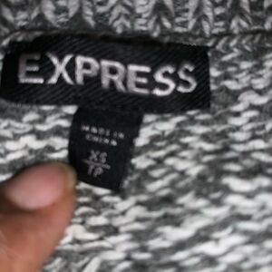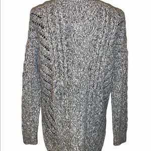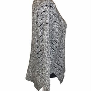 Black and white open cable knit sweater. Crewneck. Side hem slits. 60% cotton/40% acrylic. Size: XS. Preowned in good condition.