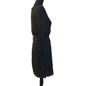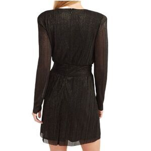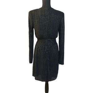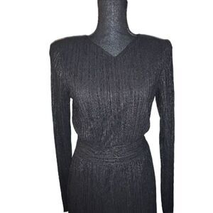 Black metallic pleated dress. V-neck. Hidden back hook and zip closure. Padded shoulders. Long sheer sleeves. Thick stretch waistband. Lined. Straight hem. Mini length. 100% Polyester. Size: small. Preowned in good condition.