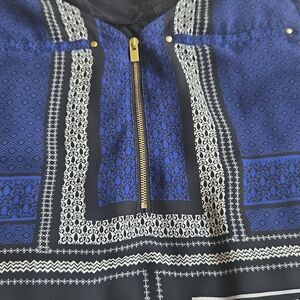 Chic sleeveless top with navy and black patterns. Features front zip detail.