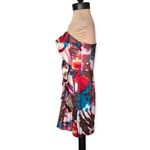 Express Silk Strapless Watercolor Cocktail mini Dress. Multi-Colored with pink/red/brown/teal.