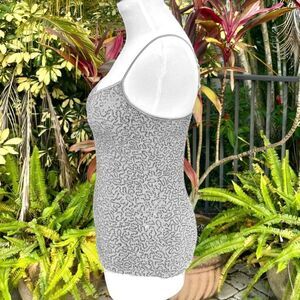 — Deep gray fabric with silver sequin design — Stretchable material — Camisole tank top — Adjustable spaghetti straps — V-neck — Length 21-22.5” (adjustable straps), pit-to-pit 13.5“ — Materials & care instructions in pictures — Excellent gently worn condition