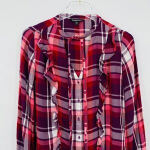 Express Size XS Pink & Red Plaid Button Down Ruffle Detail Long Sleeve Top