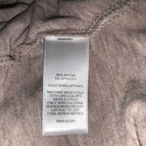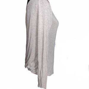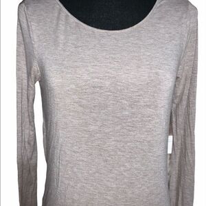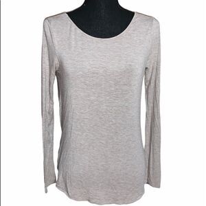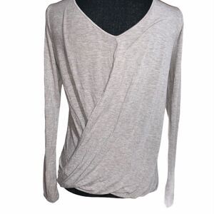 Heather brown surplice top. Surplice wear front or back. Long sleeve. Crewneck front. V-neck back. 95% rayon/5% spandex. Size: XS. Preowned in good condition.